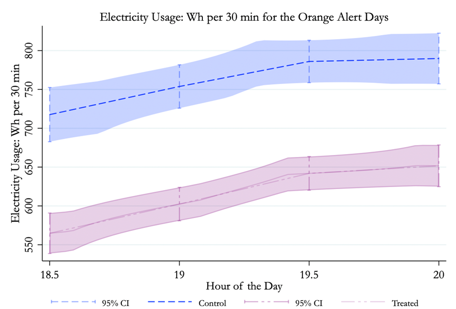 Comme le montre la figure ci-dessous, la consommation moyenne des ménages soumis à ce protocole expérimental entre 18h et 20h (courbe rose) est nettement inférieure à celle des ménages d’un groupe de contrôle (courbe bleue). La différence moyenne sur une série de 12 alertes est de l’ordre de 19,7 %, ce qui laisse entrevoir des opportunités importantes pour la gestion des pics de consommation. Il s’agit maintenant d’élargir cette expérimentation à une plus grande échelle (sur l’ensemble du territoire national) et avec une plus grande finesse d’analyse (grâce à des dispositifs d’observation innovants comme le xKy).
