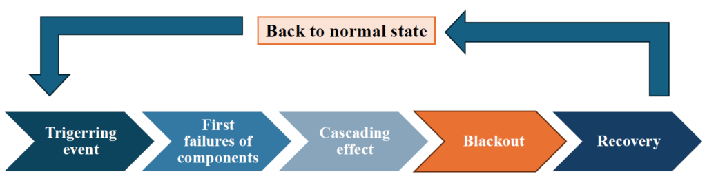 Si les protections échouent, un blackout peut survenir en quelques minutes, avec des conséquences sévères dans une économie très dépendante de l’électricité : hôpitaux et communications perturbés, activité industrielle stoppée, sécurité publique menacée. Le rétablissement est complexe : il faut d’abord évaluer les dégâts et lancer les réparations, souvent retardées par des routes impraticables, des inondations ou des conditions météorologiques défavorables, et le réseau peut subir d’autres dommages si sa stabilité n’est pas assurée. La remise en service doit être progressive : on démarre par les centrales capables de se relancer seules (hydraulique, batteries), puis on reconnecte les autres segments en priorisant les services vitaux comme les hôpitaux, tout en maintenant la stabilité globale. Les énergies renouvelables peuvent aider à la reprise, mais leur variabilité complique la coordination.
