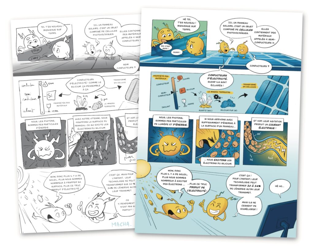 Nous avons démarré notre collaboration en mars 2024. J’ai participé à ce projet en tant qu’illustratrice, mais aussi sur la narration, pour s’assurer que les sujets soient bien vulgarisés tout en restant compatibles avec les attentes du collectif Solaire PV. Le résultat devait être dynamique, accessible et donner envie d’aller plus loin sur ce sujet. Il fallait attiser la curiosité et répondre à des questions qu’on n’avait même pas conscience de se poser.