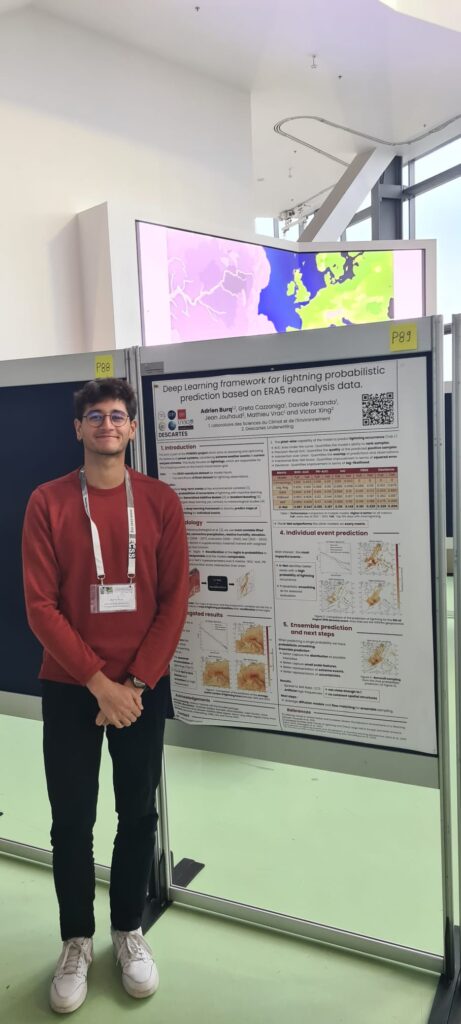 Dans son poster « Deep learning framework for lightning probabilistic prediction based on ERA5 reanalysis data », Adrien Burq présente un nouveau modèle prometteur pour prédire les éclairs en exploitant la structure spatiale de l’événement à l’aide d’un réseau de neurones profond (U-Net). Pour ces travaux, le jeune chercheur a reçu le « audience’s favorite poster » résultat d’un vote du public