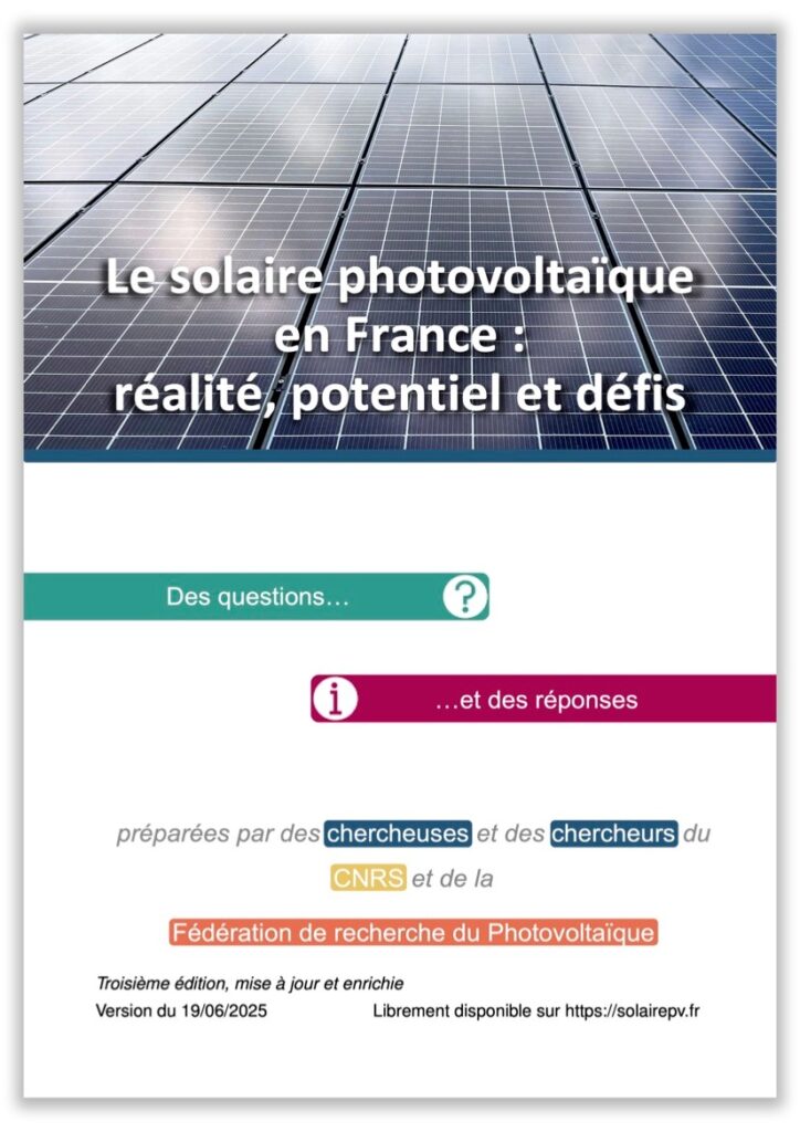Fin 2021, un petit groupe de chercheuses et de chercheurs du Centre National de la Recherche Scientifique (CNRS) et de la Fédération de Recherche Photovoltaïque (FedPV) a formé un atelier pour travailler collectivement sur les questions posées par le développement du solaire photovoltaïque en France. Ce travail a abouti à l’élaboration du guide : « Le solaire photovoltaïque en France : réalité, potentiel et défis » et du site web associé.