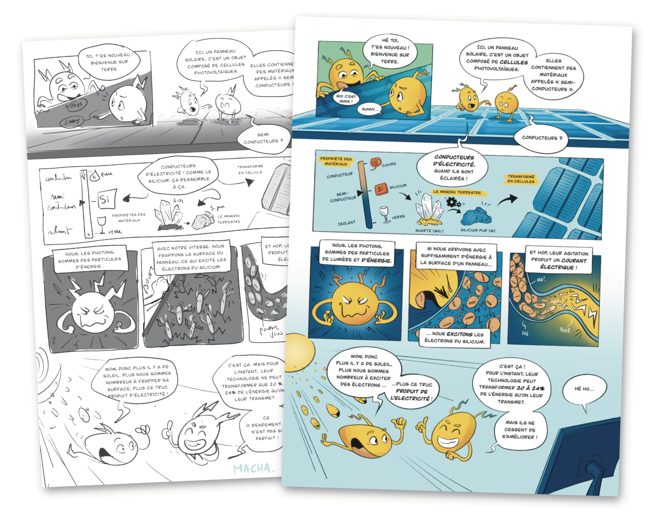 Dans un premier lieu, il fallait bien entendu définir un certain nombre de sujets. L’objectif étant d’introduire la thématique de l’énergie solaire, nous nous sommes concentrés sur les notions de base comme la fabrication panneaux photovoltaïque, leur déploiement, la production d’énergie ou encore la fin de vie. Au total, c’est une vingtaine de sujets qui sont abordés dans cette série de planches.